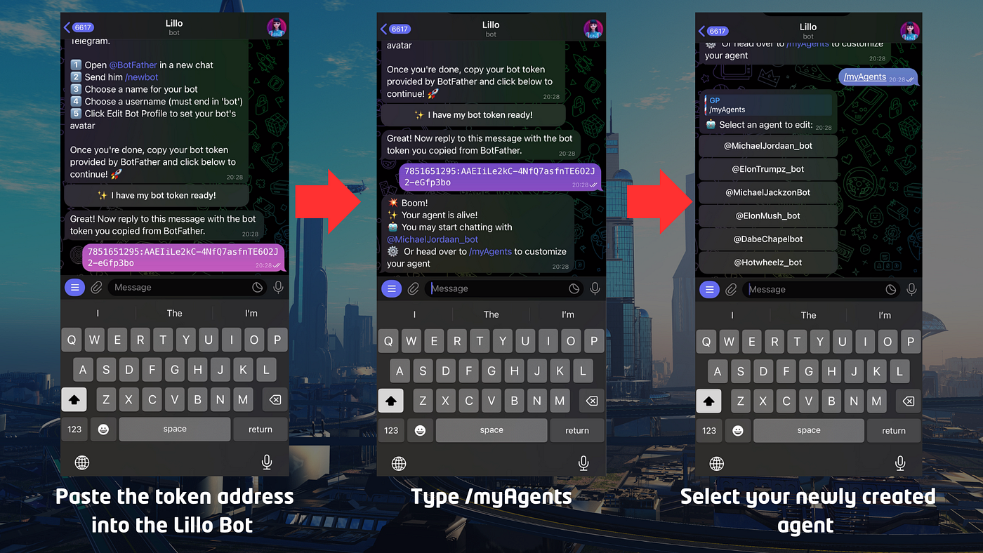 Navigate back to your chat with Lillo, click “I have my bot token ready!” and paste the message leaving only the access token code. Once done, click on “/myAgents”.