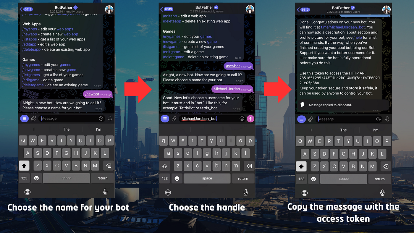 Specify the name and handle for your AI Agent. Once completed BotFather will create a unique access token for your bot which you need to copy.